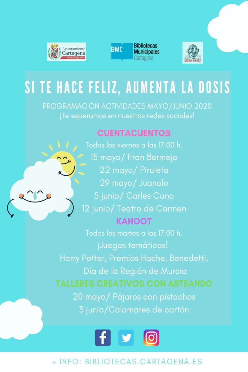 Desde el viernes 15 de mayo hasta el 12 de juniopasarán por las redes sociales de las bibliotecas de Cartagena los cuentacuentos, Fran Bermejo, Piruleta, Juanolo, Carles Cano y Teatro de Carmen. “Gracias al éxito que tuvimos con las dos sesiones realizadas en abril con la herramienta Kahoot! donde a través de juegos averiguamos los conocimientos en literatura de los usuarios de las bibliotecas municipales de Cartagena, hemos apostado en esta programación por ampliar estas sesiones, y todos los martes a las 17 horas haremos juegos temáticos de Harry Potter, Premios Hache, Benedetti y el Día de la Región de Murcia” indica Piñana.